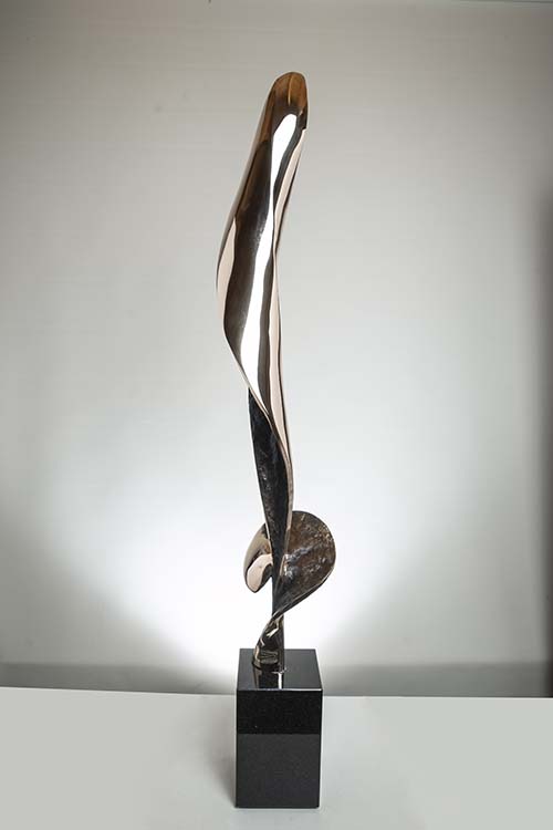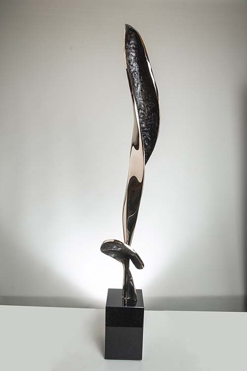 Lyrisch abstracte bronsplastieken waarvan de kleur een extra dimensie toevoegt aan de beweging.