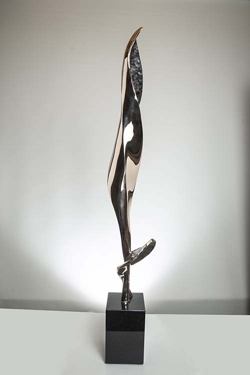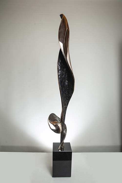 Lyrisch abstracte bronsplastieken waarvan de kleur een extra dimensie toevoegt aan de beweging.