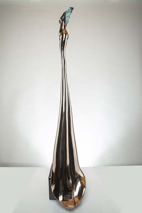 Lyrisch abstracte bronsplastieken waarvan de kleur een extra dimensie toevoegt aan de beweging.