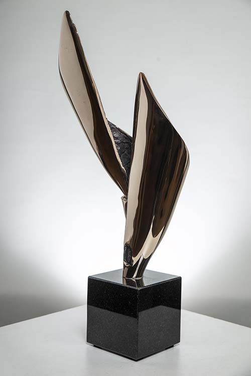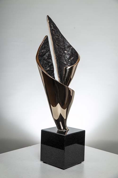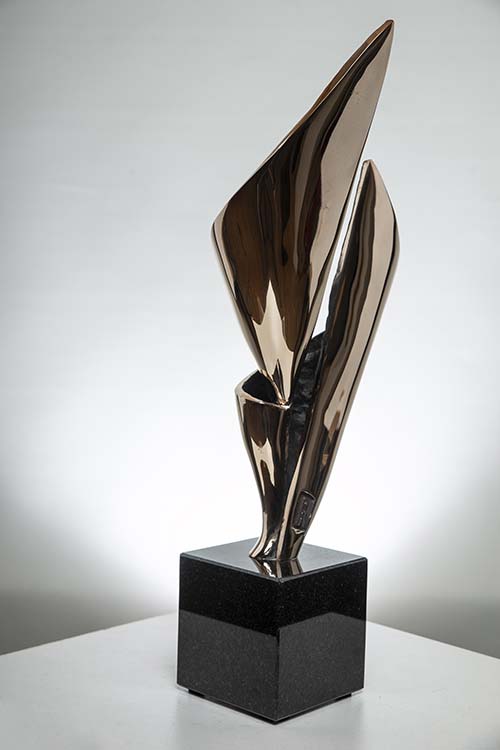 Lyrisch abstracte bronsplastieken waarvan de kleur een extra dimensie toevoegt aan de beweging.